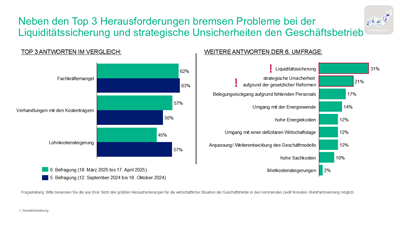 Die Ergebnisse zeigen: Die Unternehmen passen sich wirtschaftlichen Belastungen an, stehen aber weiterhin vor großen Herausforderungen. Strategische Unsicherheit, komplexe Reformprozesse und der anhaltende Fachkräftemangel erschweren die Planung. Gleichzeitig gibt es nur leichte Entspannung bei den Verhandlungen mit Kostenträgern.