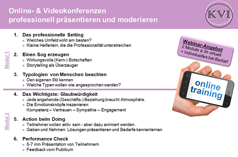 Ein Thema in einem Video oder auf einer Online Konferenz kompakt und fesselnd zu behandeln, ist eine Herausforderung. Mit CORONA hat ein neues mediales Zeitalter begonnen, so dass die KVI Initiative ein Online Training konzipiert hat, um Sie fit für die Präsentationstechniken der Zukunft zu machen.